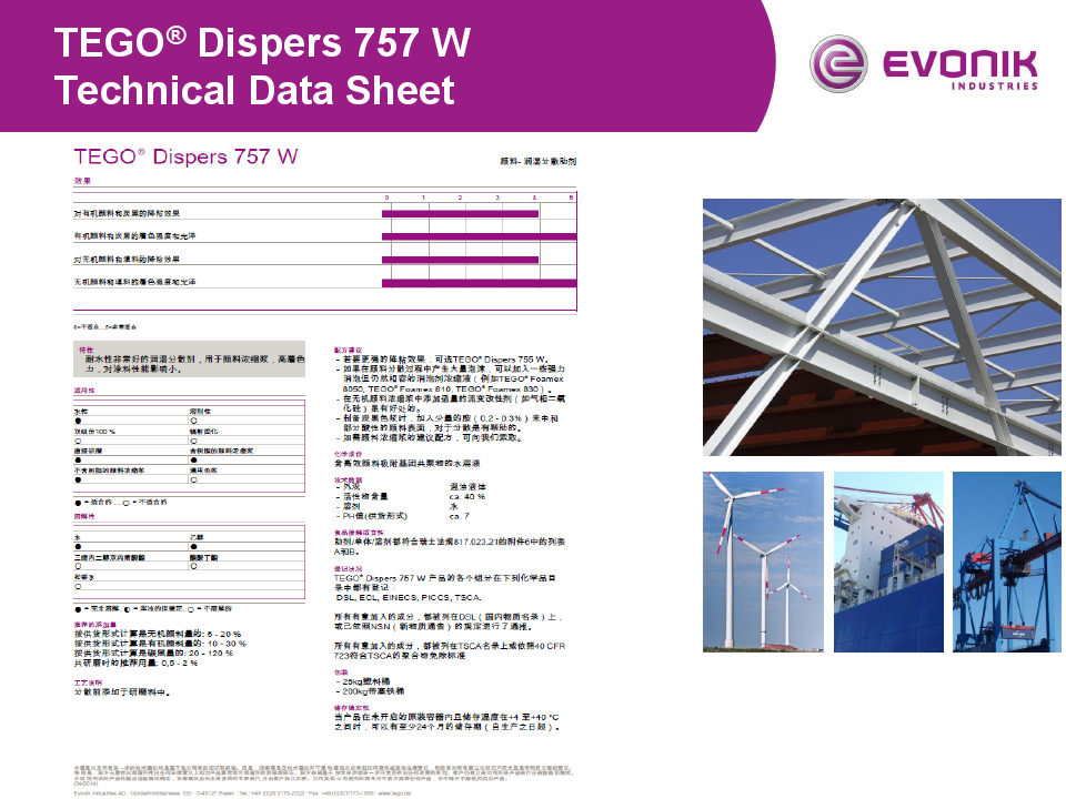 01. > > > TEGO 分散劑 性能 < < < > > > TEGO 757 低的吸水性 < < 03. > > > TEGO 757 的耐鹽霧性能 < < < 04. > > > TEGO 757 節(jié)約成本 < < < 05. > > > TEGO 757 優(yōu)異的相容性 < < < 06. > > > TEGO 757 水性高性能涂料首選 < < < 07. > > > TEGO 757 技術(shù)信息 < < < 08. > > > TEGO 757 有機(jī)顏料參考配方 < < < 09. > > > TEGO 757 無(wú)機(jī)顏料和炭黑參考配方 < < < 10. > > > TEGO 757 產(chǎn)品說(shuō)明書(shū) < < < TEGO 757分散劑 索樣熱線18688841669張先生 佛山三升貿(mào)易 TEGO 740W 分散劑 產(chǎn)品鏈接 高性價(jià)比型 TEGO 760W 分散劑 產(chǎn)品鏈接 碳黑降粘型 TEGO 752W 分散劑 產(chǎn)品鏈接 啞光和透明氧化鐵防沉性優(yōu)異用于耐用性涂料色漿的分散劑