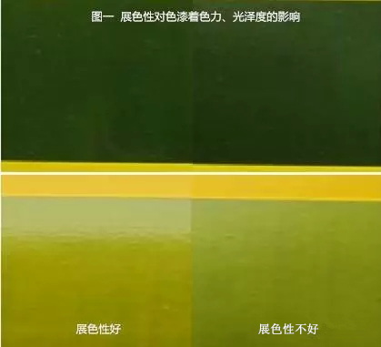 色漿加入基礎漆后展色性的好壞決定了該色漆的著色力、光澤度、鮮艷度、耐候性等性能(見圖一、圖二)。展色性不好的主要表現(xiàn)是色漆在施工時可以明顯發(fā)現(xiàn)有色點、輥痕、刷痕;同一批色漆隨時間的推移顏色變深或變淺。尤其是藍灰色系、咖啡色系、灰色系顏色。