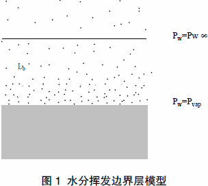 水分揮發(fā)界面層擴散模型(見圖1)認為水分子揮發(fā)進入空氣,其液氣界面的蒸汽壓達到水的飽和蒸氣壓,水氣界面上方存在一個高度為Lb 的邊界層,邊界層上部水的蒸氣壓與大氣環(huán)境水蒸氣壓相同,在邊界層內(nèi),隨著高度增加從界面的飽和蒸氣壓線性降低到外部環(huán)境水的蒸氣壓。水的揮發(fā)速度決定于水分子擴散通過此邊界層的速度。