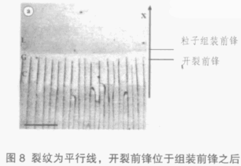 假如分散體因應力產(chǎn)生裂紋的話,裂紋通常是一些平行線,并出現(xiàn)一個裂紋前鋒,且裂紋前鋒位于粒子組裝前鋒之后,裂紋前鋒跟隨粒子組裝前鋒推進而推進。