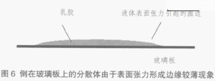科學家感興趣的是為何會產(chǎn)生這種水平干燥的現(xiàn)象,將乳膠或高分子分散體倒在玻璃板上時,由于表面張力作用其乳膠邊緣出現(xiàn)圓弧現(xiàn)象,邊緣較薄,見圖6。