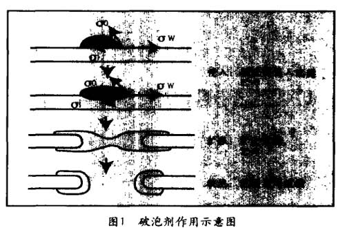 破泡劑通過吸附泡和與表面張力的作用侵入泡膜。其后,表面張力將破泡劑擴散于泡膜的表面,使泡膜變薄,破壞泡沫(如圖1所示)。