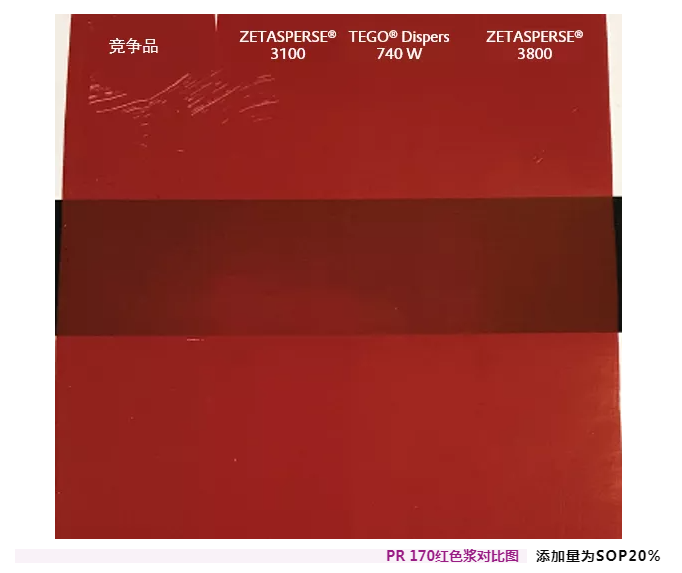 可以看出,TEGO® Dispers 740W雖然和TEGO® Dispers 760W、ZETASPERSE®182、ZETASPERSE®179一樣是中分子的低成本潤濕分散劑,但它的表現(xiàn)和通用性,并不亞于高分子競爭品、TEGO® Dispers 755W、ZETASPERSE® 3800等高成本潤濕分散劑。即使在低添加量SOP20%的情況下,也能得到低粘,穩(wěn)定的無樹脂色漿。