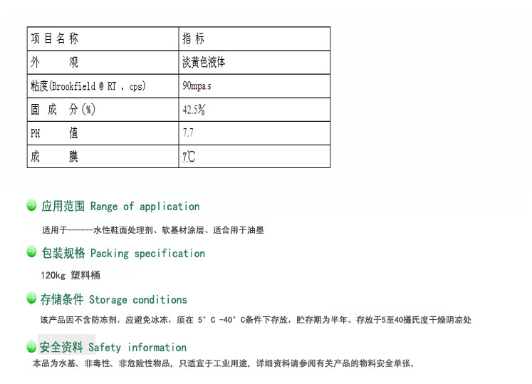 • 用途:水性鞋面處理劑,軟基材涂層,適合用于油墨