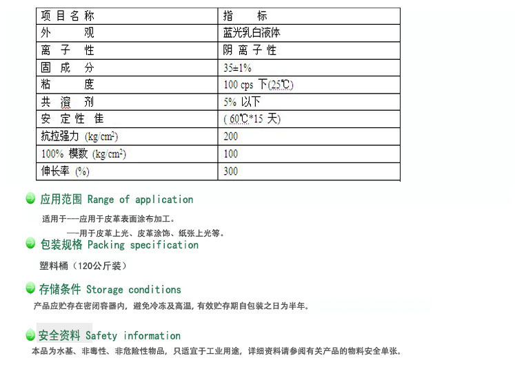 - 用途:皮革表面涂布加工,皮革上光、皮革涂飾和紙張上光等