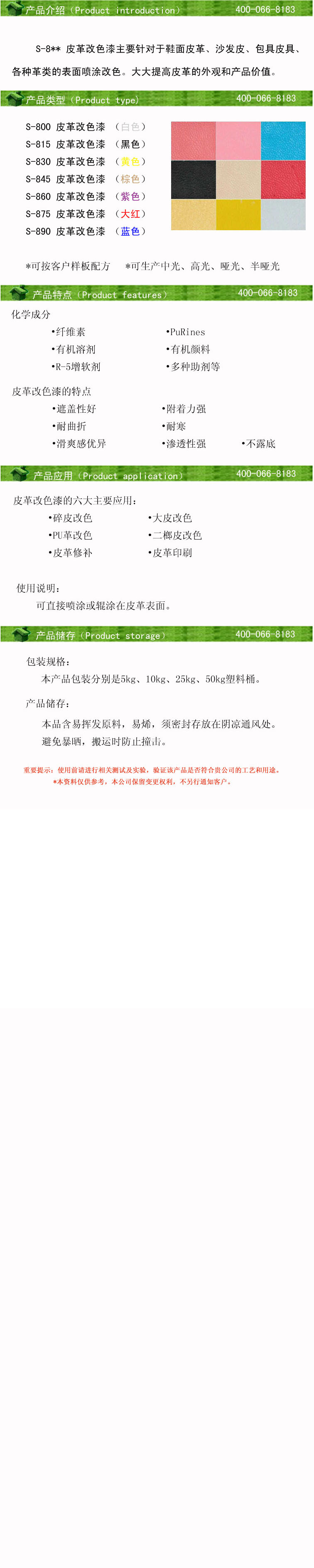 - 能應(yīng)用于合成革、真皮、磨砂皮革、絨面皮革表面增艷噴劑,其特點(diǎn)為:提升鮮艷度、增加滑爽感、養(yǎng)護(hù)皮面,能使皮面艷麗、提升價(jià)值感。